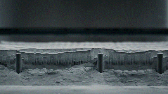 完成一层,打印平台下移 60 微米——大约一根头发丝的宽度,再铺上新的粉末层,继续熔化。